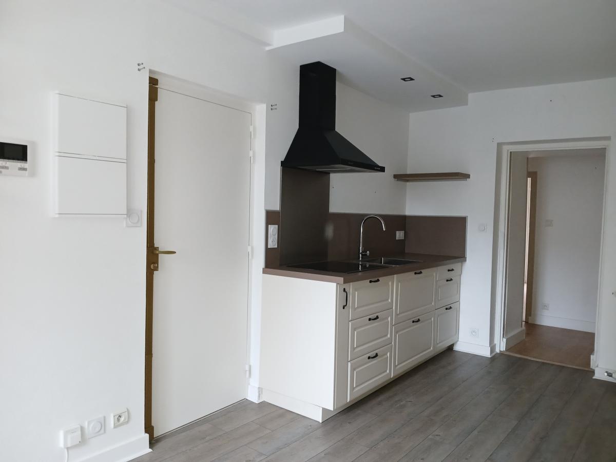 Centre ville de LAMBALLE, un appartement situé au 1er étage sans ascenseur comprenant : cuisine aménagée et équipée (four, plaque induction, hotte), salon/séjour, salle d'eau, wc, buanderie, grande chambre avec rangement et bureau.