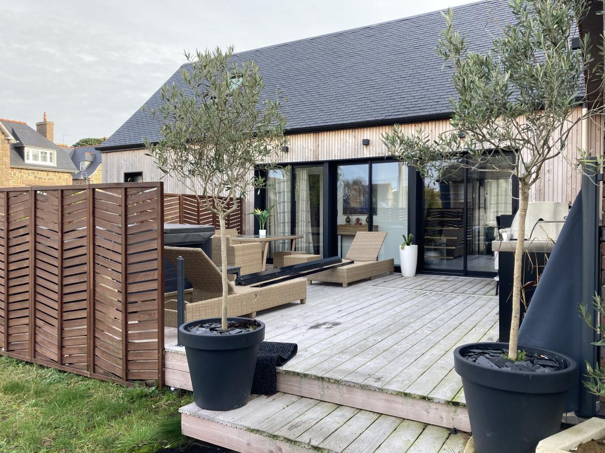 Deux terrasses privatives dont l'une permet l'accès à un espace équipé d'une buanderie et de rangements.
