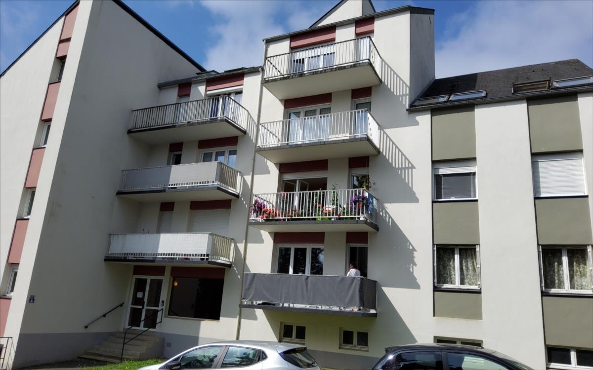 CARHAIX, proche du centre-ville très bel appartement T.4 de 77 m² au 1er étage comprenant :Séjour et coin cuisine aménagée et équipée (grand balcon), couloir (placards), 3 chambres, salle d'eau, WC.