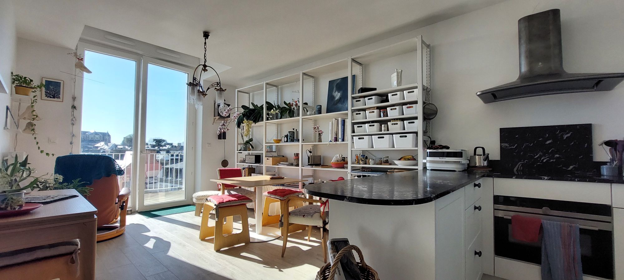 Cuisine (aménagée et équipée) ouverte sur le séjour, chambre, salle d'eau avec wc et grand balcon. Avec une place de stationnement privative et un cellier. Vue dégagée. Exposition à l'Ouest.