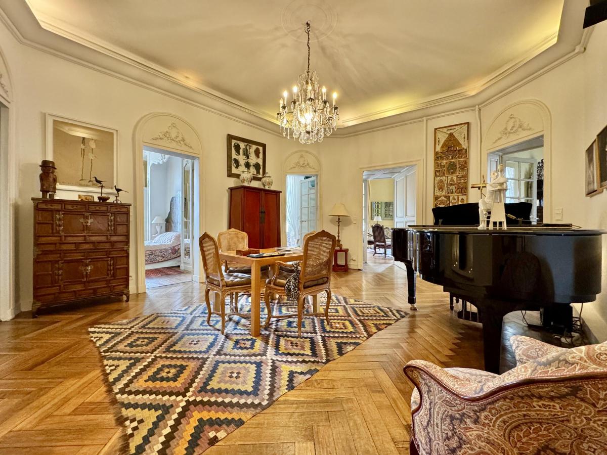 L’appartement se compose de sept pièces principales, dont un salon de réception aux volumes généreux, une salle à manger conviviale, une entrée secondaire plus intime, une cuisine indépendante ainsi que quatre chambres. Une salle de bains, une salle d’eau et de nombreux rangements complètent l’ensemble.