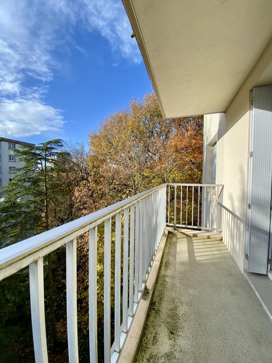Pièce de vie sur parquet avec beau balcon exposé Ouest donnant sur verdure,