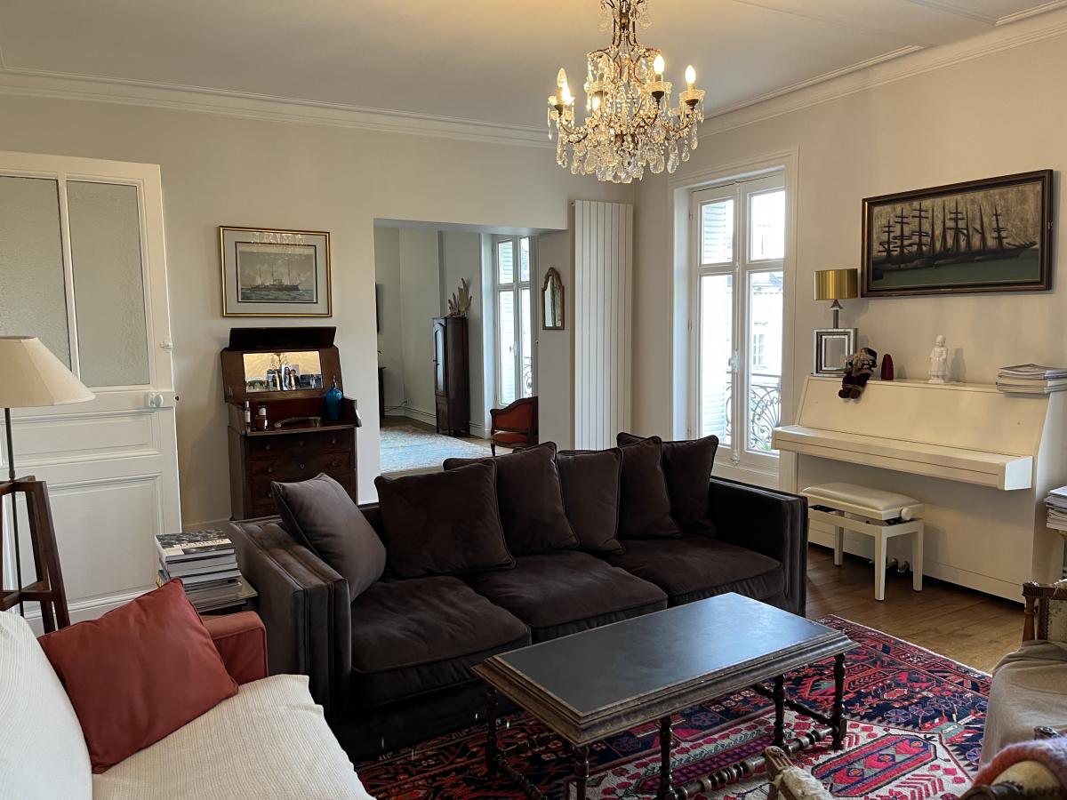 NANTES gare Nord, Jardin des plantes. Dans un immeuble ancien, au pied du jardin des plantes et au calme. Appartement de type 5 situé au 4ème étage avec ascenseur d'une surface carrez de 151,54 m², comprenant ; entrée et dégagement - Un Séjour de 32,01 m² et un Salon de 33,49 m² à la suite. Une Cuisine de 12,81 m². 3 chambres de 14,13 - 14,48 et 14,50 m². Placards et lingerie. Autre dégagement et Salle de bains (baignoire et douche)- WC. 2 caves au sous-sol. Chauffage gaz. Beau volume. Vue sur le jardin des plantes et au calme.