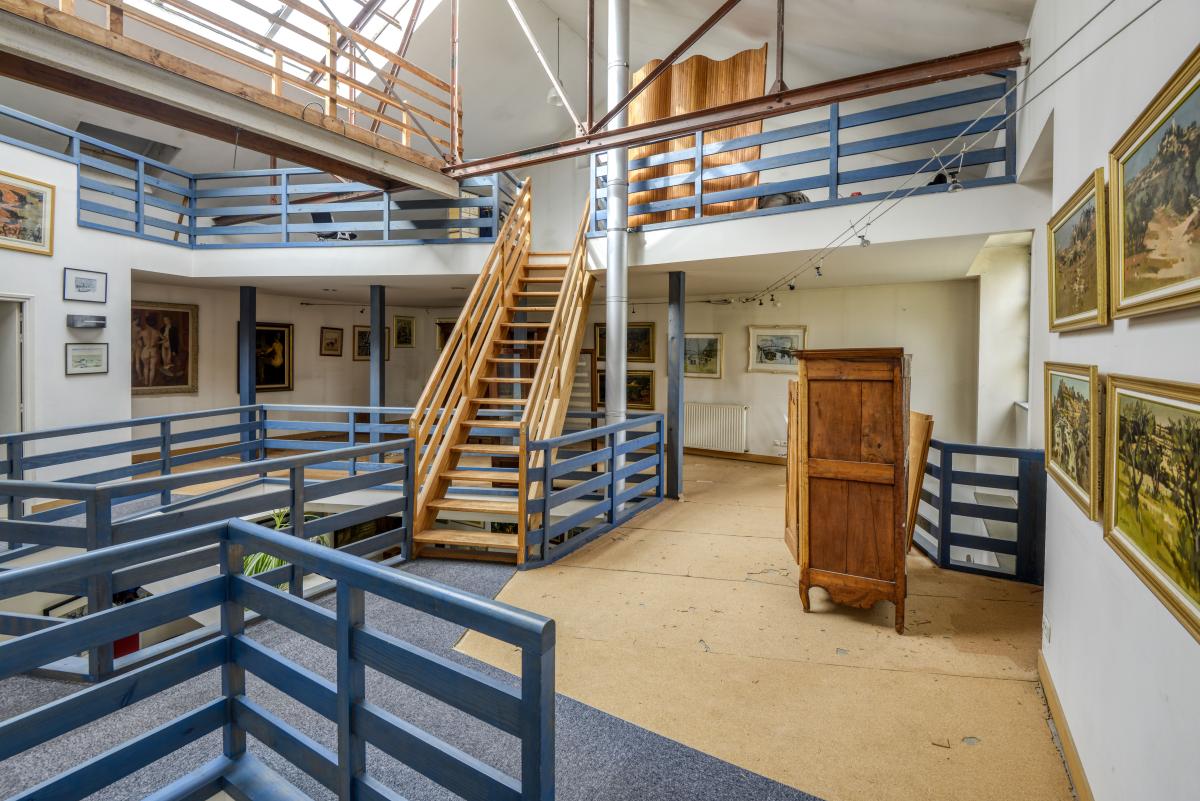 Ce bien rare séduit par ses volumes spectaculaires et son architecture atypique. La pièce de vie avec cuisine ouverte offre près de 70 m², sublimée par une hauteur au faîtage de 11 mètres, des passerelles intérieures, une mezzanine et de larges apports de lumière naturelle.