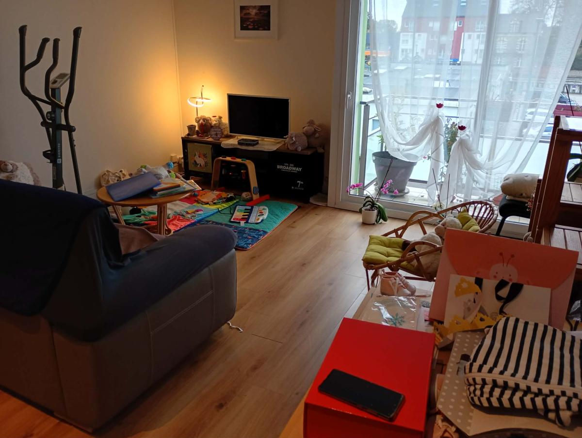 - entrée (1,71m²), salon (21,23m²) donnant sur un balcon de 3,83m², cuisine équipée (8,95m²) avec séchoir, dégagement (2,72m²), 2 chambres (9,56 / 10,49m²), dressing (2,85m²), salle de bains (3,08m²), WC (1,03m²);