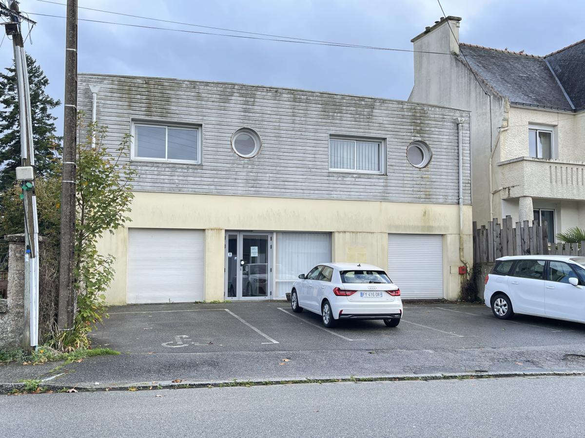 Immeuble de bureaux à vendre en centre-ville 56500 MORBIHAN , construit en 2000 avec une extension de 2007, le local professionnel sur 3 niveaux avec double accès, comprend entrée, bureau d’accueil avec WC, 3 salles d’attente (dont une avec WC), 6 bureaux dont un avec terrasse, chaufferie, archives et WC. En rez-de-jardin : studio avec accès indépendant comprenant : salle de pause, rangements, sde avec WC. Cour avec espace couvert orienté sud, parking au nord. Assainis. collectif. Pos. de transformation en maison d’habitation.
