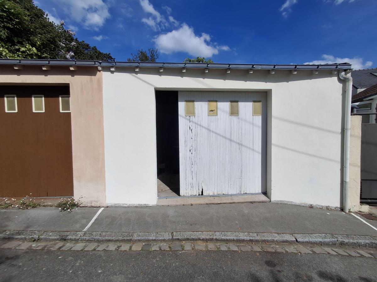 Nantes Chantenay, rue des Alouettes, garage d'environ 27 m2 sur dalle de béton et murs en parpaings, avec mezzanine pour stockage supplémentaire. Charpente et toiture tuile en très bon état.