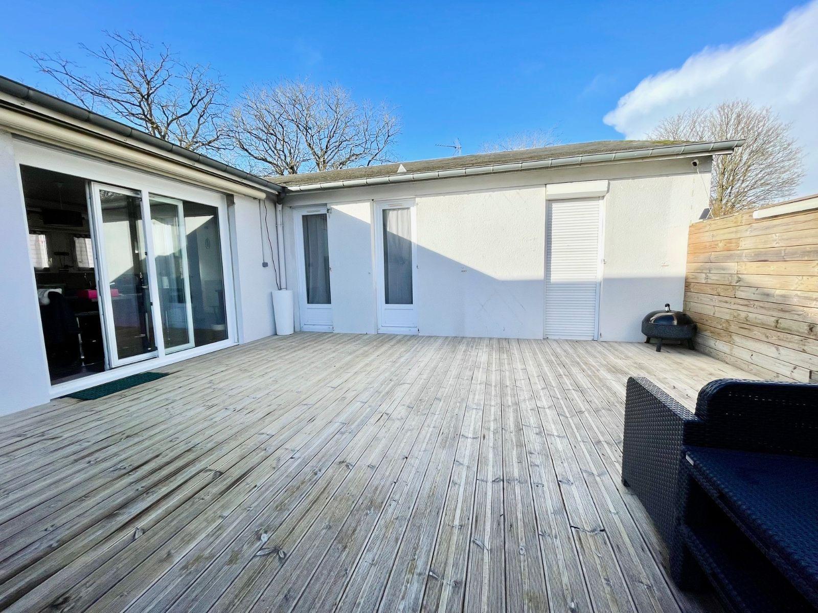 Maison de plain pied, terrasse, jardin et garage.