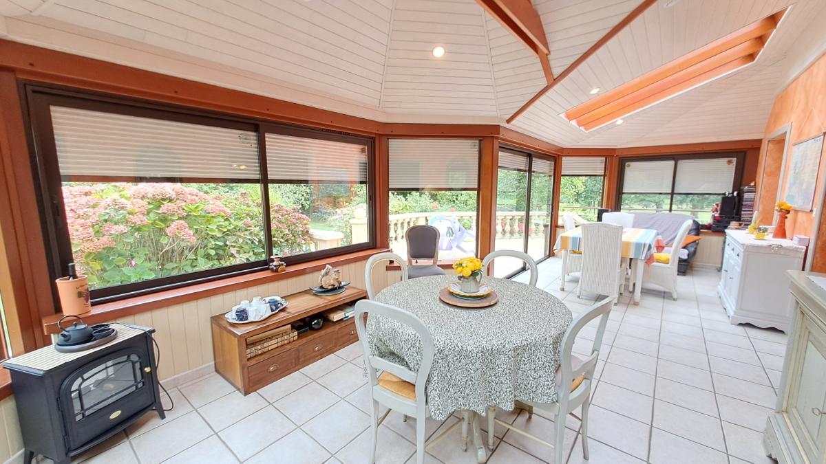 - Au rez-de-chaussée : Ce niveau vivable de plain pied offre une entrée ouvrant sur une vaste pièce de vie d'environ 67 m² comprenant une véranda lumineuse, un double salon avec poêle à bois, une cuisine ouverte aménagée et équipée, un W.C., ainsi qu'une suite parentale avec dressing et salle d’eau avec W.C. (aux normes P.M.R.). Deux terrasses accessibles depuis les pièces de vie complètent ce niveau.