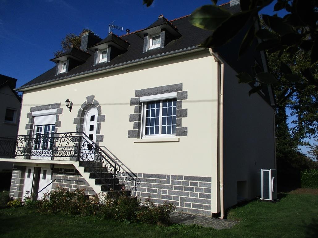 Maison néo-Bretonne sur sous-sol complet compartimenté : garage, cave et chaufferie, à 2 min de Carhaix, comprenant au rez-de-chaussée surélevé : Une entrée, une cuisine, un salon-séjour avec poêle à pellets, une chambre, une salle d'eau et toilettes. A l'étage : Palier desservant deux chambres, grenier et toilettes. Terrain de 800 m². Travaux récents : Isolation, électricité, assainissement, chaudière.