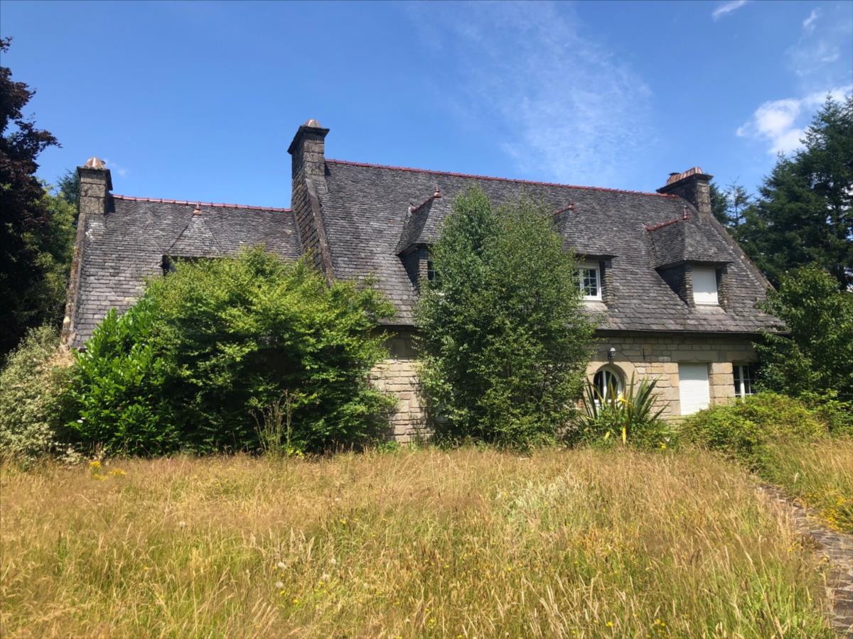A deux pas d'Huelgoat, cette charmante maison en pierres, construite sur cave/garage compartimenté, se compose au rez de chaussée d'une entrée, une salle de séjour avec grande cheminée accès terrasse, une cuisine aménagée et équipée avec insert à bois, une arrière cuisine, une chambre, un bureau, un wc avec point d'eau. A l'étage quatre chambres avec rangements, un dressing, une salle d'eau à finir de rénover avec wc séparé.Grand terrain attenant arboré, l'ensemble pour 7 800 m2.