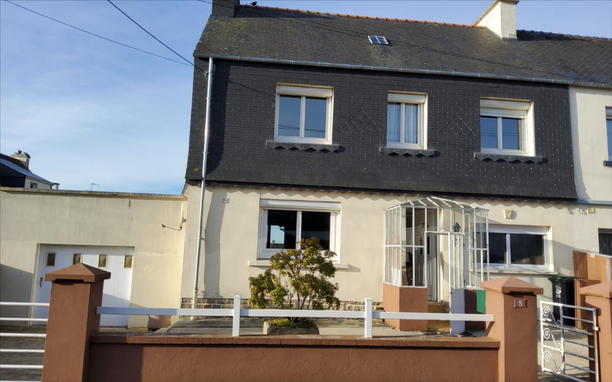 Carhaix, une maison d'habitation mitoyenne, en pierres sous toiture ardoises (et pignons bardés en composit), construction 1967 comprenant :- Au rez-de-chaussée : Entrée, séjour, cuisine, cellier, wc.