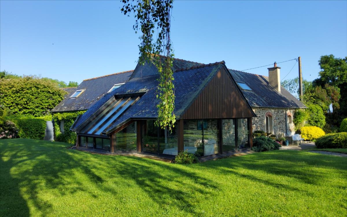 CARHAIX, Très jolie maison en pierres sous toiture ardoises comprenant :- Au rez-de-chaussée : Entrée (placards), office/chaufferie, grande pièce de vie avec salon et cheminée, grande véranda, cuisine aménagée et équipée, partie nuit avec entrée indépendante et sas donnant sur 3 chambres (dont 1 avec cabinet de toilette), salle de bains, WC