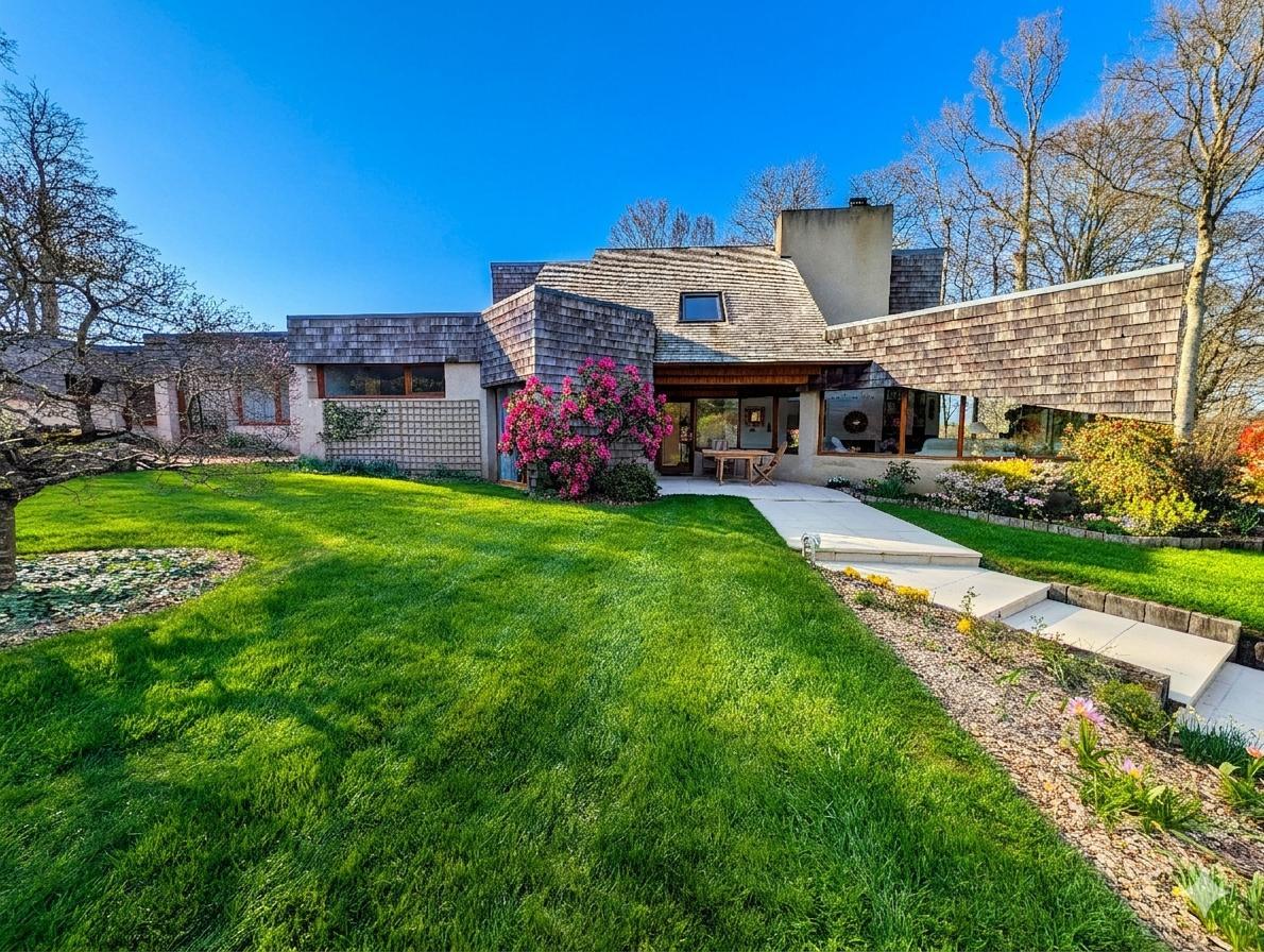 GARLAN, à 10mn de la mer et à proximité de Morlaix, très belle propriété d'architecte avec piscine couverte et chauffée (pompe à chaleur), située dans un cadre champêtre et à l'abri des regards au cœur d'un beau jardin paysager. La maison comprend une entrée, cuisine, salle à manger, salon avec cheminée, arrière cuisine, cave à vins, wc. Partie nuit 5 chambres, salle de bains, salle d'eau, wc, lingerie, bureau. Studio avec entrée indépendante comprenant une chambre, salle d'eau (accès PMR) , wc et 1 pièce. A l'étage : bureau, chambre, dressing, salle de bains et douche, wc, solarium. Carport 2 voitures. Atelier, appentis. Terrain 6860 m². Très belles prestations.