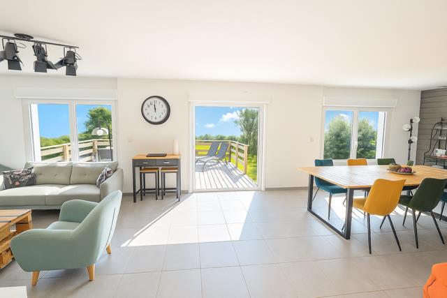 LOCMARIA-PLOUZANÉ - En vente uniquement à l'étude - Située à mi chemin entre le BOURG et les PLAGES - Cadre Campagne à Proximité des écoles et arrêts de cars - Laissez-vous séduire par cette Charmante Maison de 134m² Habitables, idéale pour une vie de FAMILLE paisible et confortable - L'entrée indépendante dessert d'un côté une cuisine entièrement aménagée et équipée de belle facture (semi-ouverte) et de l'autre une grande PIECE DE VIE, baignée de lumière avec ses larges ouvertures exposées SUD/OUEST - Un POËLE à GRANULÉS moderne pour plus de confort avec une chaleur DOUCE et ÉCONOMIQUE - Accès direct à une BELLE TERRASSE en BOIS pour Profiter des longues soirées d'été entre amis et y admirer les superbes couchers de soleil !!!! AUCUN VIS-A-VIS de cette dernière - VUE DÉGAGÉE - Exposition SUD-OUEST - Une Chambre et un wc complètent le rez-de-chaussée - A l'étage, Une MEZZANINE vous permettra un espace bureau/bibliothèque à votre guise - 2 grandes chambres (15m² environ) avec PLACARDS ainsi qu'une vaste SALLE de BAINS (Baignoire et Douche) agrémentent ce Niveau - Un SOUS-SOL complet vous permettra un espace de stockage et/ou stationnement Appréciable - LE PLUS: une grande chambre avec sa salle d'eau privative idéale pour accueillir les amis ou la famille!!! - Le tout sur un Grand terrain de 1200m², sans le moindre vis-à-vis, offrant INTIMITÉ et LIBERTÉ en pleine Nature !! Située dans un Cadre calme et agréable, cette Maison combine CONFORT, FONCTIONNALITÉ et TRANQUILITÉ. Un véritable COUP DE COEUR à Découvrir sans tarder !!!