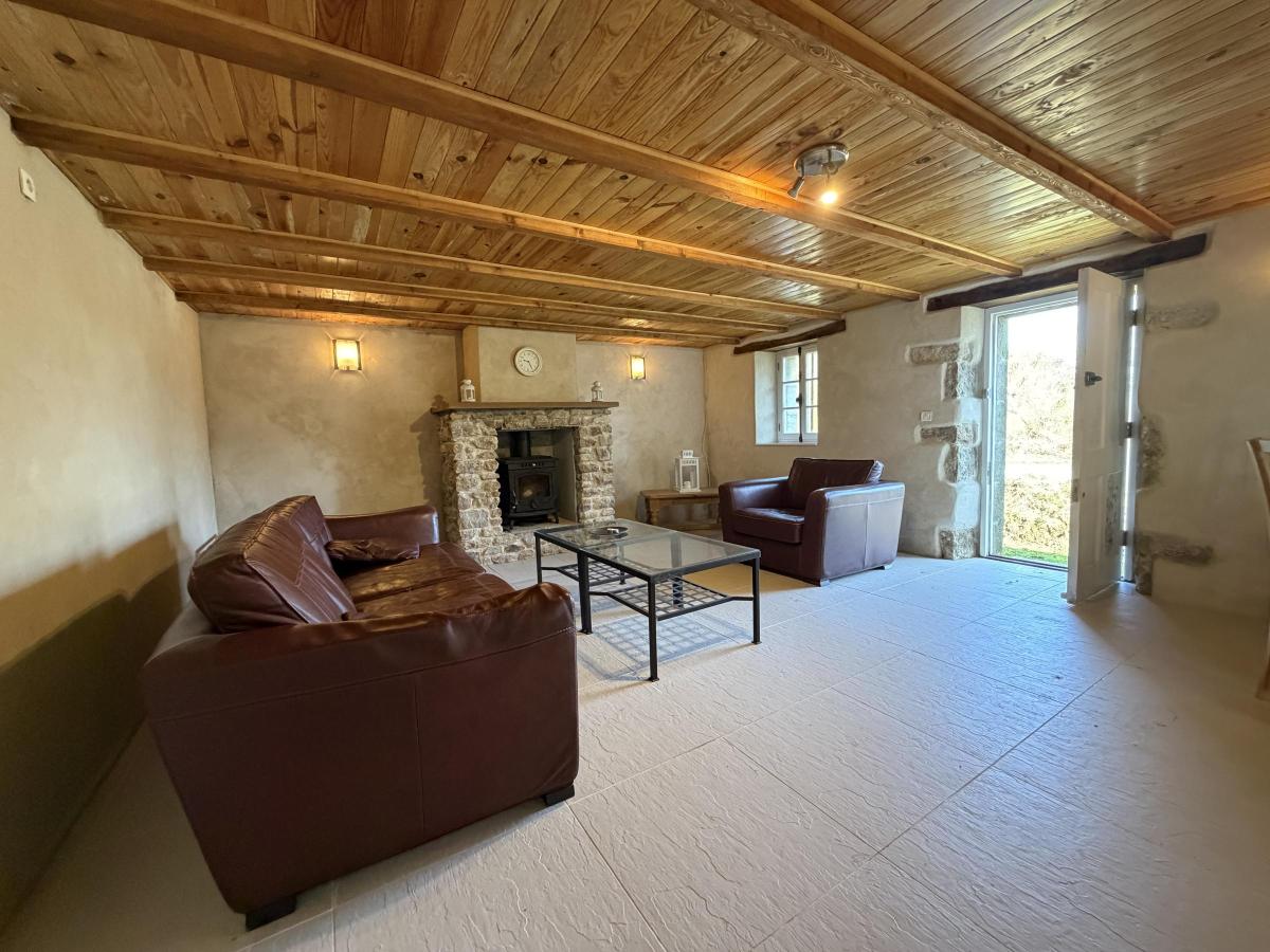 La maison offre au rez-de-chaussée une cuisine aménagée et équipée, une belle pièce de vie agrémentée d'un poêle à bois, ainsi qu’une salle de bains avec WC.