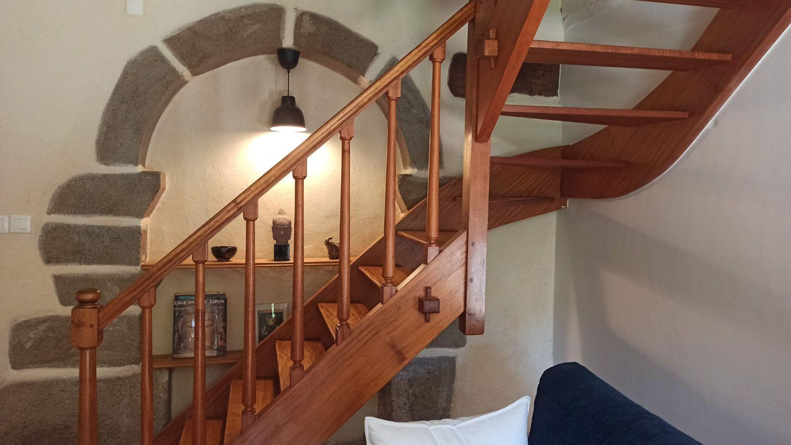 Rez-de-chaussée : Pièce principale avec poêle et cuisine ouverte équipée et aménagée, arrière-cuisine et wc.