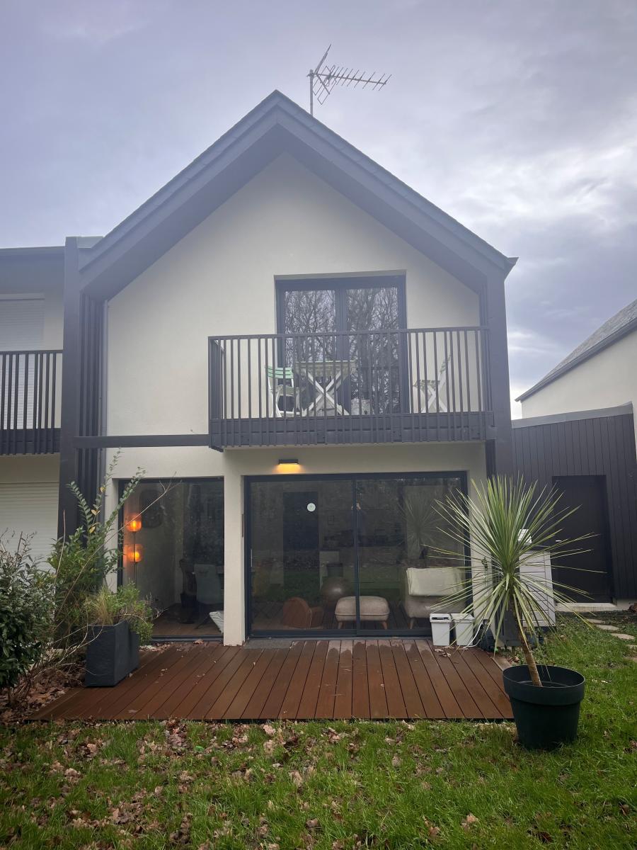 Très proche voie verte permettant un accès au centre-ville et aux plages à vélo ou à pied, maison d'habitation de 2022 avec chambre et salle d'eau de plain pied, salon/cuisine avec poêle donnant sur terrasse et jardin orientés sud ouest, buanderie , WC. A l'étage: deux chambres dont une avec balcon, salle de bain et WC. Cellier dans le jardin. deux places de stationnement privatives sous carport
