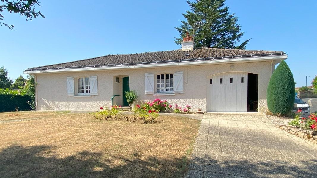 En cœur de bourg, à proximité de toutes les commodités, maison de plain-pied édifiée en 1970, d'environ 96m² habitables comprenant : hall d’entrée, WC indépendant, cuisine aménagée et équipée (14 m²), salon-séjour avec cheminée (27 m²), dégagement, trois chambres (13,7 m² – 13,3 m² – 11,4 m²) et salle de bains.