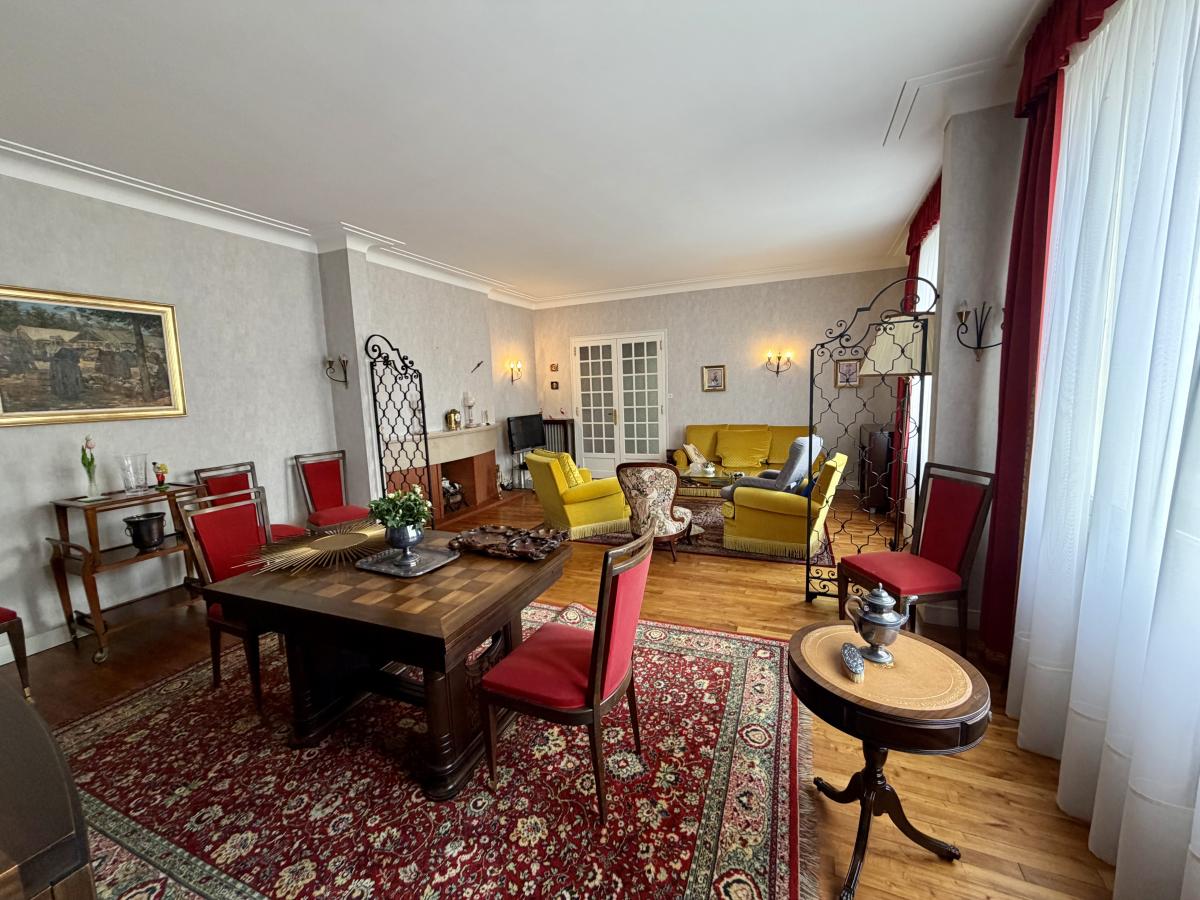 A l'étage : un pallier de 9.4 m² desservant un salon/séjour avec cheminée de 38.05 m², une cuisine aménagée de 13.07 m², une chambre avec placard de 15.85 m², un dressing de 1.46 m², une salle de bains avec wc de 5.58 m². A l'extérieur, un jardin à l'arrière de la maison offrant deux terrasses de 12 et 14 m², un puit et une cave.