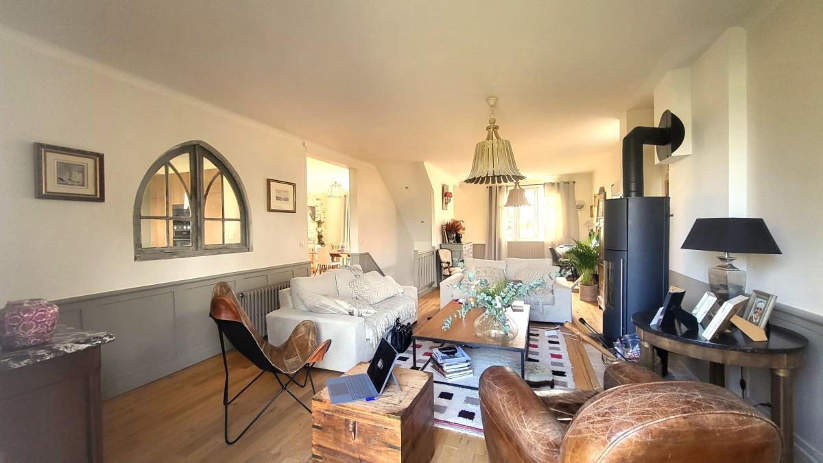 - Au premier étage, un magnifique espace de vie traversant baigné de lumière vous accueille. Il se compose d’un double salon d’environ 37 m² avec poêle, bénéficiant lui aussi d’un accès direct à la terrasse, d’une salle à manger de 14 m² pouvant facilement être transformée en chambre supplémentaire, ainsi que d’une cuisine aménagée et équipée ouverte sur la terrasse.