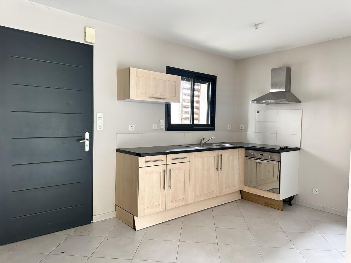 Au rez-de-chaussée : Pièce de vie traversante avec cuisine ouverte équipée et donnant sur jardin, WC séparés avec lave mains.