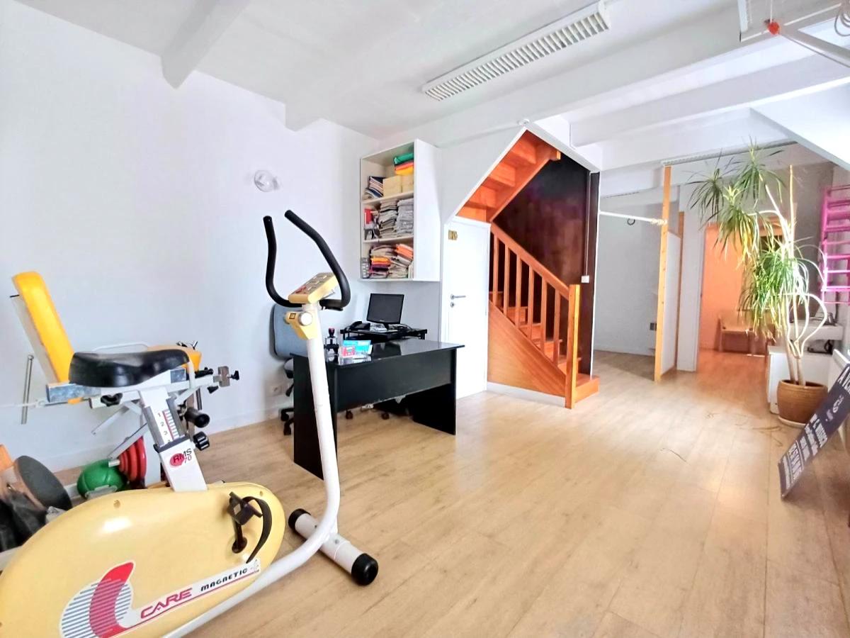 A l'étage: deux pièces dont une avec un coin cuisine, une salle d'eau avec wc.