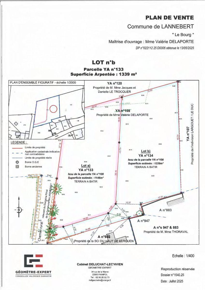 Nous vous présentons un terrain à bâtir situé à Lannebert, d'une superficie totale de 1339 m² (Lot B). Ce bien est proposé à un prix de 69 200 euros. Le terrain est situé dans un environnement calme, offrant des possibilités pour la construction d'une maison selon vos projets personnels.