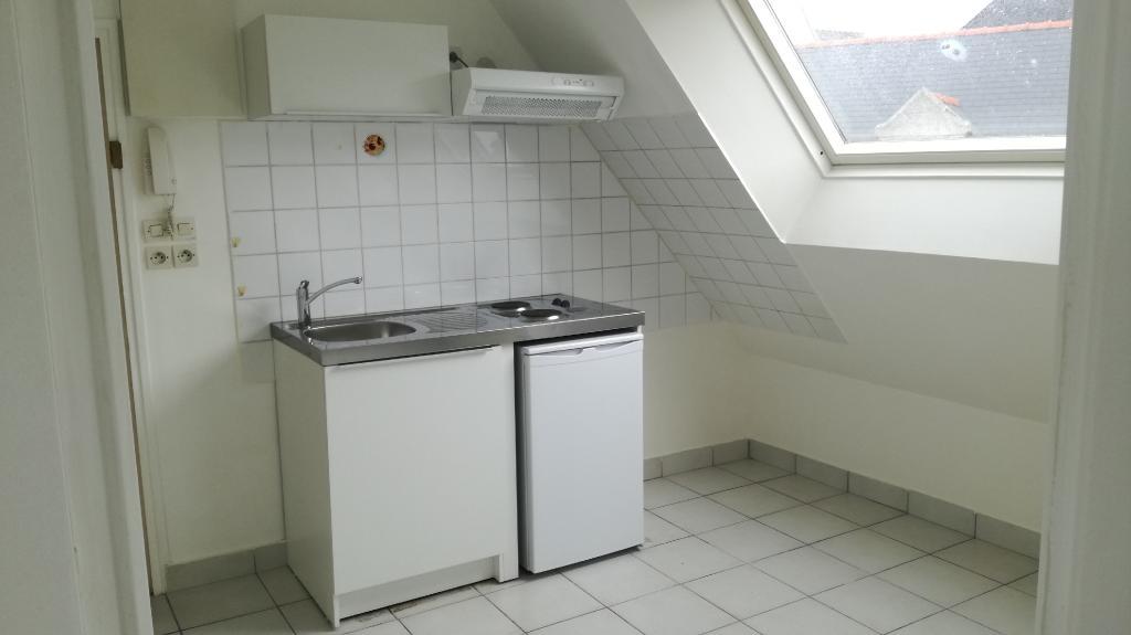 Salle avec placard et une kitchenette (frigidaire, hotte), une chambre avec placard, salle d'eau, WC.